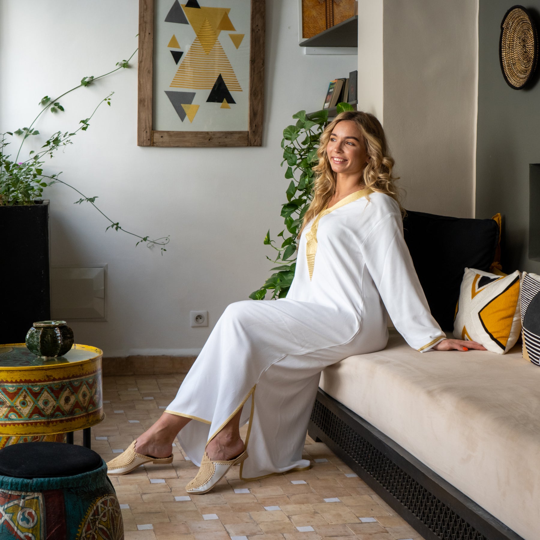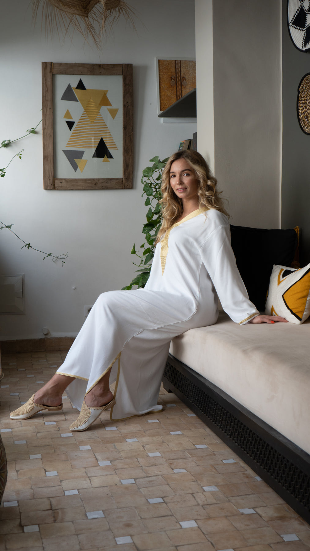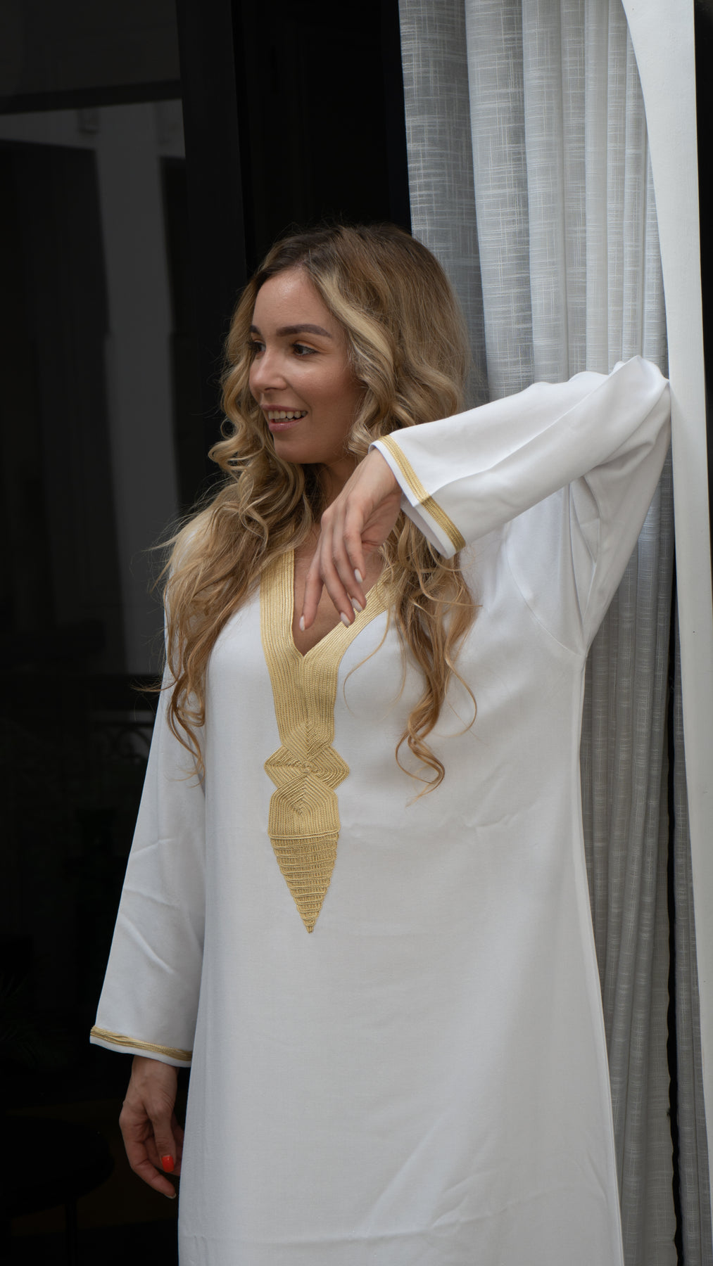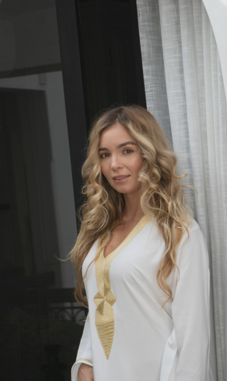 דגם קוטוביה בהשראת המסגר המפורסם בעולם שנמצא במרקש משלב בד לבן עם רקמה עדינה וקלאסית בגווני זהב עם גזרה מחמיאה ונינוחה. הגלביה עשויה מבד כותנה נעים ונושם (לא שקוף) ומתאימה ללוק קז'ואל אלגנטי – ליום, לחופשה או לערב קליל עם טאץ' אתני ייחודי.